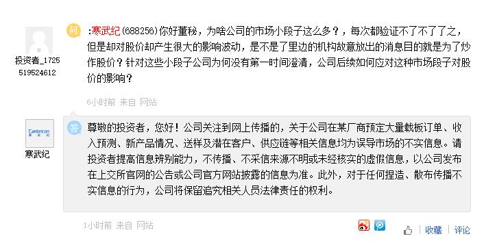 面對這種近乎癲狂的行情,寒武紀在12日晚緊急回應稱,公司關注到網上傳播的關於公司在某廠商預定大量載板訂單、收入預測、新產品情況、送樣及潛在客户、供應鏈等相關信息均為不實消息;之後在14日晚再次闢謠併發布風險提示。