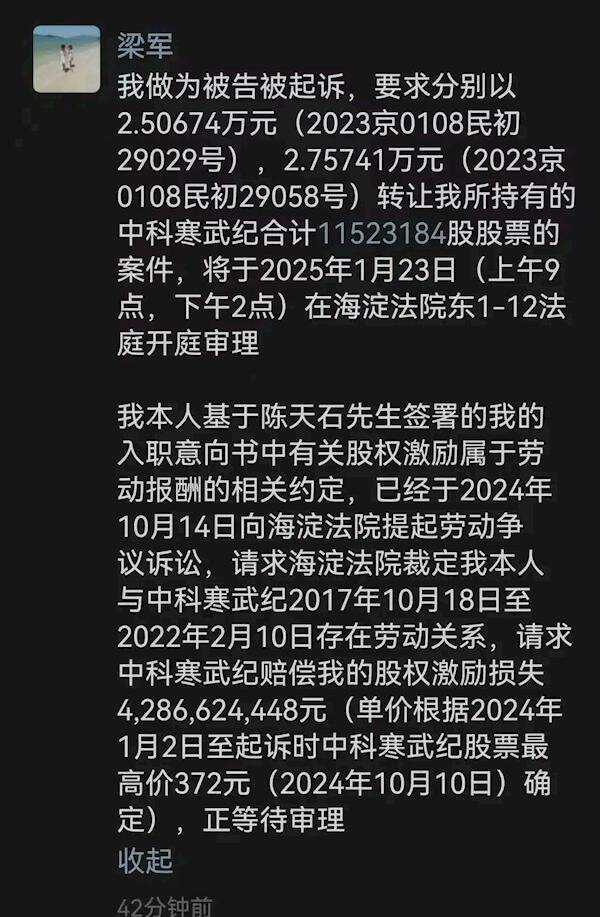 事情還要追溯到今年1月20日,當時,梁軍在朋友圈發文,披露了其與寒武紀的重大勞動與股權糾紛,訴訟金額高達42億元。核心爭議圍繞其間接持有的超過1152萬股股票是否應以原始出資額(約5.2萬元)進行強制回購展開。