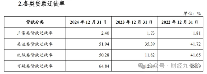 而且桂林銀行的新增不良生成壓力大,貸款遷移率大幅增長。據財報數據顯示,2022年至2024年,該行不良貸款生成率分別為1.12%、1.35%、1.68%;各類貸款遷移率水平也值得警惕。