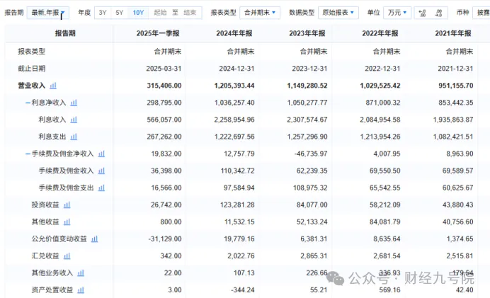 拆解桂林銀行的營收構成,作者發現該行的業績主要依賴利息淨收入,2021年至2024年該行利息淨收入分別為85.34億、87.1億、105億、103億,分別佔當期總營收的89.7%、84.6%、92%、86%,到了今年一季度,利息淨收入佔營收比重進一步增至94.7%,可見利息淨收入佔營收的比重非常之高。