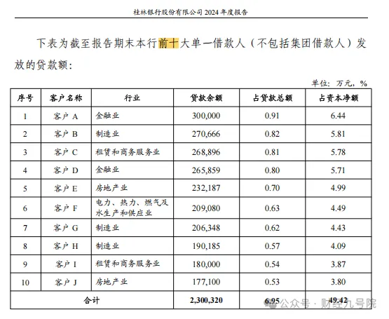 據該行2024年年報數據顯示,至去年底桂林銀行前十大單一借款人累計借款230億元,佔同期貸款總額的6.95%、同期資本淨額的49.42%,已經接近50%的業內紅線;