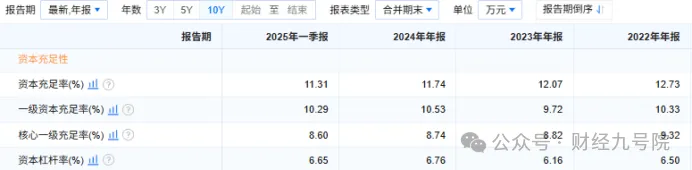 資本充足率方面同樣出現惡化,資本充足率從2022年的12.73%降至2024年的11.74%,至今年一季度末進一步降至11.31%,一級資本充足率、核心一級資本充足率等均有不同程度下滑。