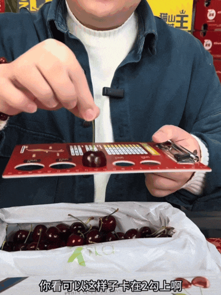 最簡單就是在標準上做文章。比如有水果博主就揭秘,測試車釐子大小的卡紙上,2J的車釐子是達到不了3J標準的,但稍微換個角度就可以卡住。有一些直播間就會用這種方式偷樑換柱,抬高價格。