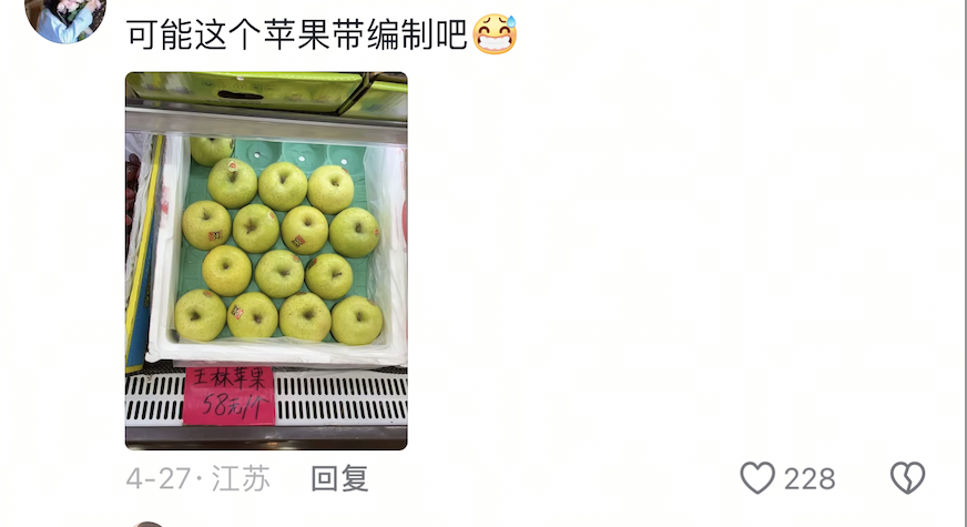 還有網友發自己看到的蘋果的價格,58元一個時,忍不住説起怪話:“可能這個蘋果帶編制的吧?”