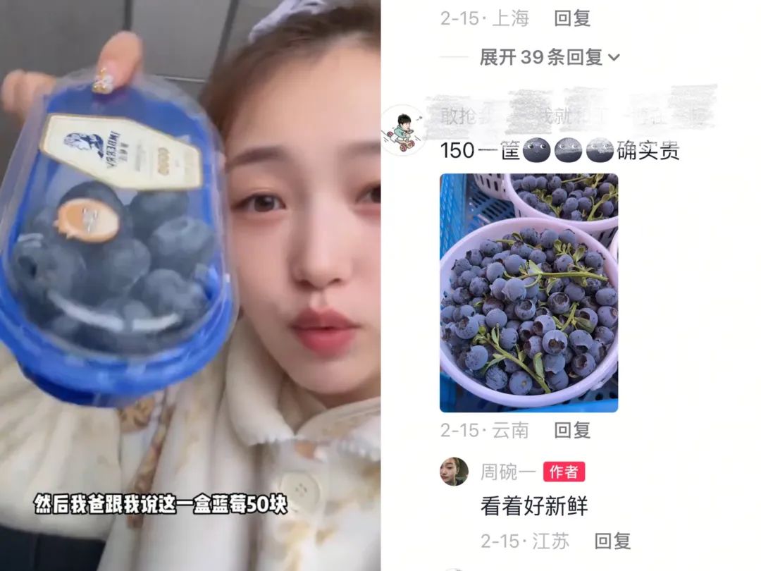 比如有網友在超市買的雲南藍莓,一盒50塊,她問雲南的藍莓真的這麼貴嗎?有網友就發了個圖,説這一筐才150。
