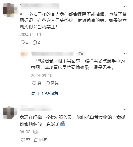 在Sam帖子的評論區,有類似心聲的經營者像找到了組織,紛紛大吐各自的苦水。有人發現一名顧客把煙頭按在了餐盤;有人被客人拍桌子辱罵,讓其趕緊拿出煙灰缸讓他們使用;有的店內被客人扔了一地煙頭,差點燙壞木地板。
