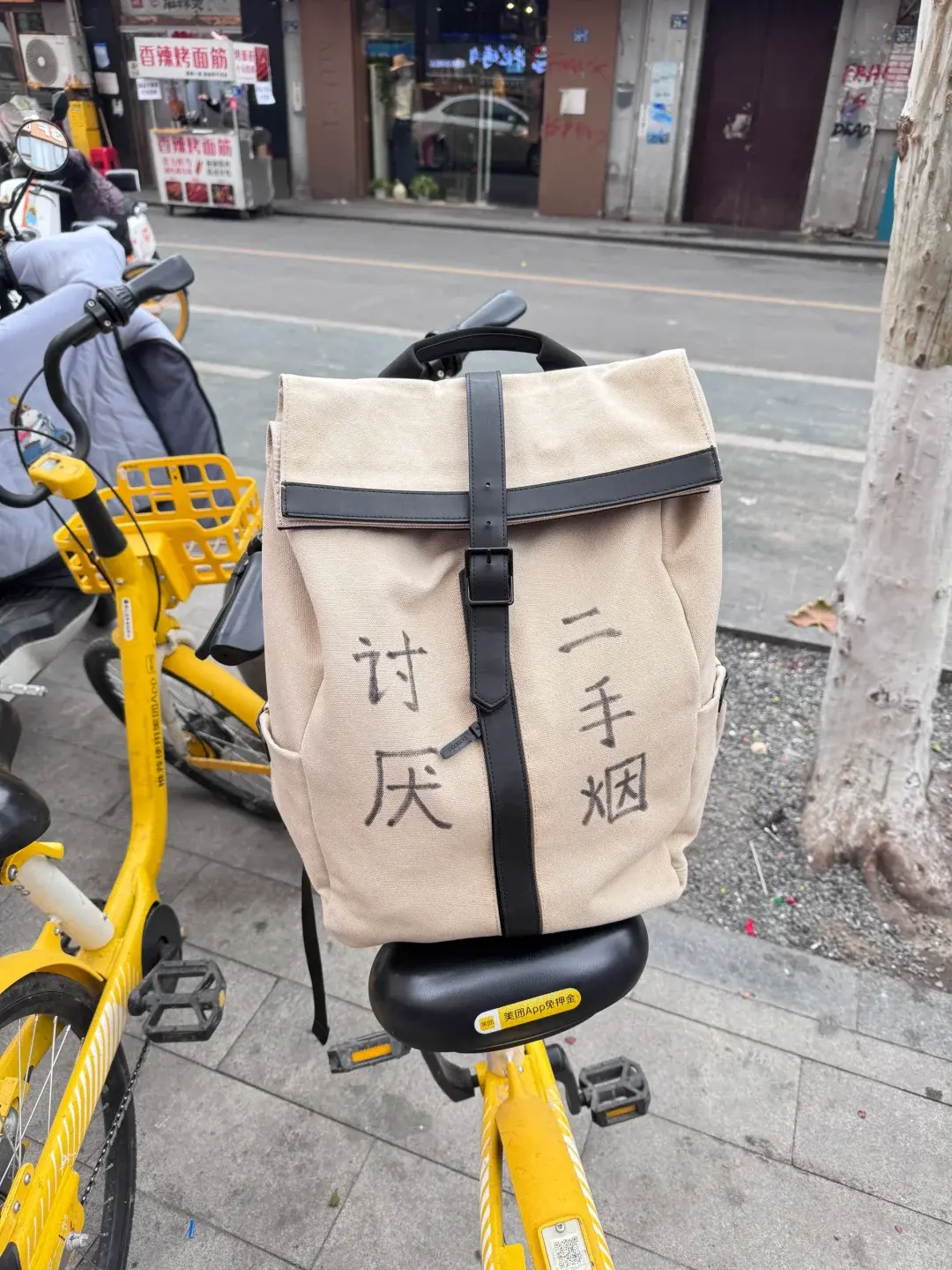 對二手煙的反抗,滲透進了蘇崎生活中每一個角落。他把“拒絕二手煙”的揹包掛件掛在身上,經常使用的書包上也寫着“討厭二手煙”五個大字。有一次,蘇崎騎着共享單車下班,後面有一個大叔騎着電動車經過,嘴裏念出掛件上的字,吐槽了一兩句,揚長離開了。