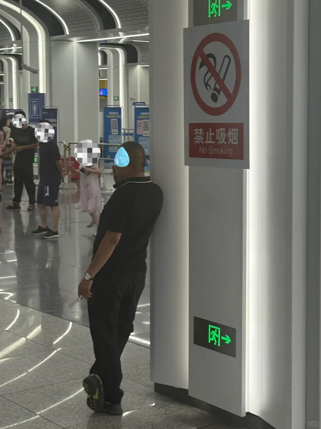 在一個封閉的車站裏,有人站在“禁止吸煙”的牌子下抽煙。(圖/受訪者提供)