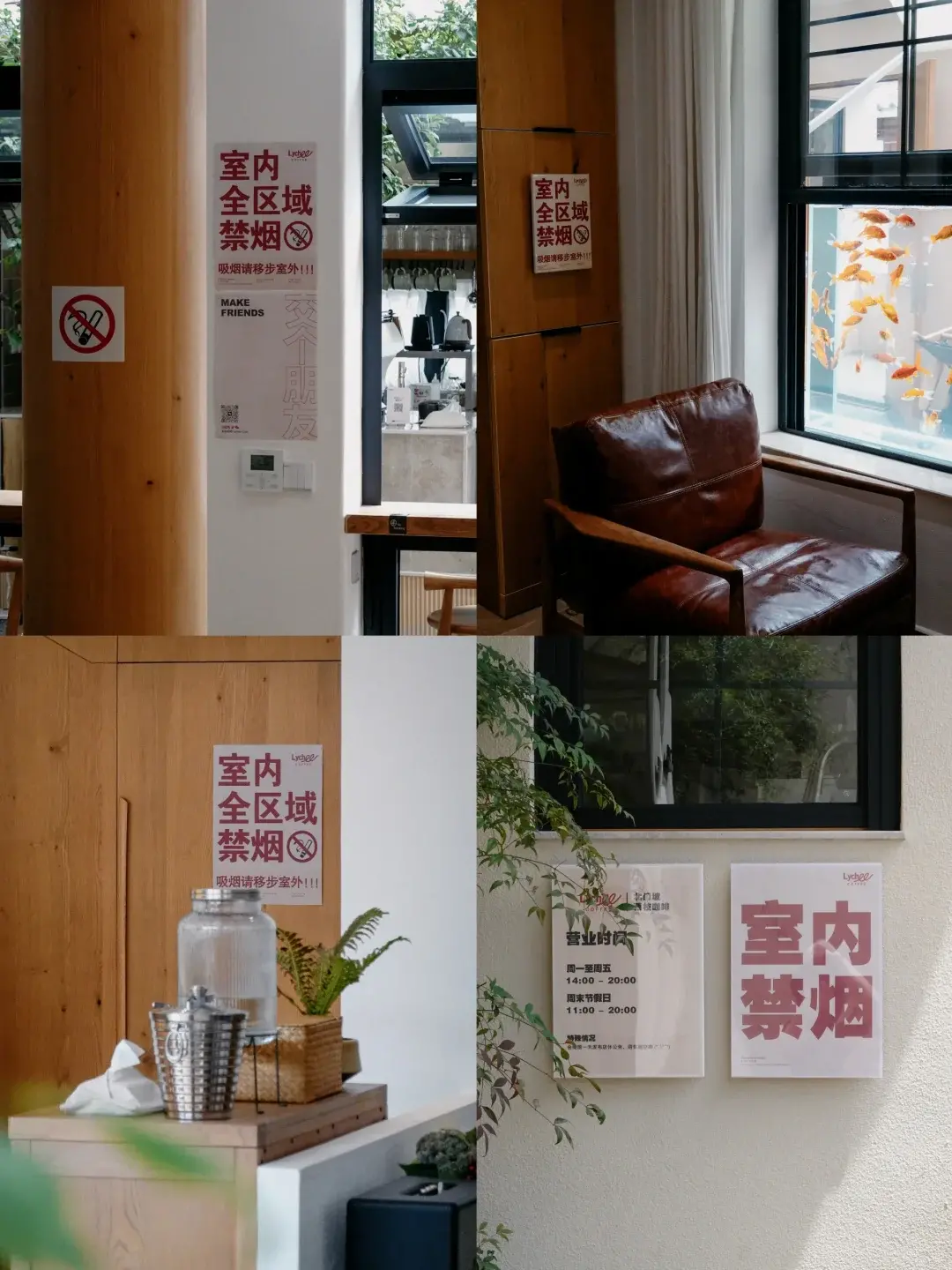 哪怕是簡單掃一眼店裏環境,也可以發現,咖啡店內貼了不少於十張大小不一的“禁止抽煙”的標語或圖案。在咖啡店社交媒體賬號的簡介一欄,除了咖啡店的地址、營業時間外,還有一句“禁止吸煙,謝絕打牌”。