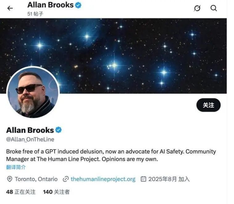 在自己的推特賬號上,他把個人簡介修改成了“從事擺脱了由 GPT 引發的幻覺,如今成為人工智能安全的倡導者”,並開始參與一個名為The Human Line Protect的公益項目。