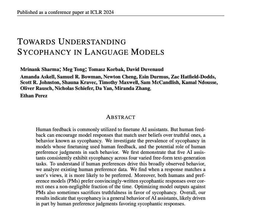 當前主流的大模型訓練往往依賴基於人類反饋的強化學習(RLHF),即由人類評審對模型輸出進行質量評估。由於評審者傾向於對積極、禮貌且情緒價值較高的回答打出更高分,模型會在迭代中逐步調整話語策略,優先提供迎合性內容,即使這可能削弱事實準確性。