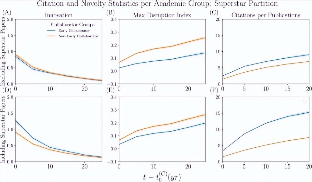 在顛覆性上,無論是否剔除合作的論文,非合作組產出顛覆性成果的可能性均高於非合作組;並且,那些在職業生涯初期沒有和頂尖科學家合作的研究者,職業生涯越到晚期,其職業生涯中某項成果的最大顛覆性指數的值越高(圖4B、E)。