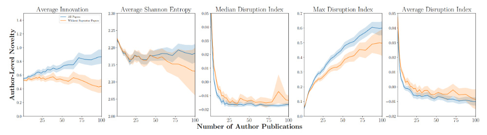 圖1中橫軸是研究者發表的論文數,可以看到,包含頂尖科學家作為合著者的論文(藍線),相比不包含頂尖科學家的(橙線)引入了更多的概念及組合,即創新性更高。從顛覆指數最大值看(圖1左4),那些與頂尖科學家合作的研究具有更高的顛覆性。