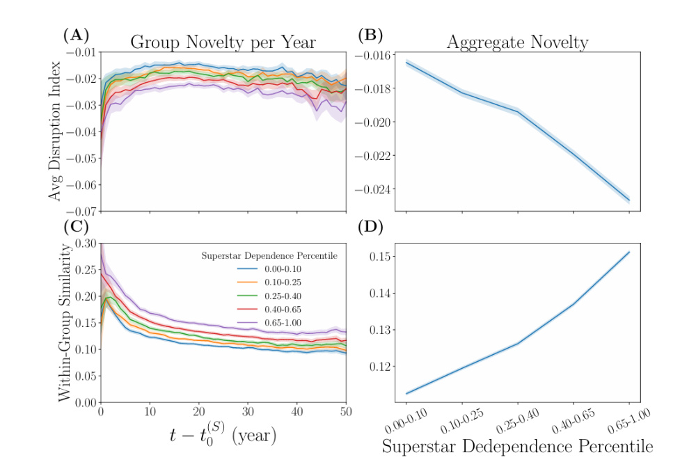 其中紫色線代表的一組中,他們65%以上的論文都會引用頂尖科學家的論文,即受頂尖科學家影響最大。該組平均顛覆指數最低,且受頂尖科學家影響越大,顛覆性越低(圖3A)。同時,研究者受到頂尖科學家啓發的佔比越高,其做出研究的組內相似度越高(圖3C)。圖3B和D中,橫軸對應引用頂尖科學家論文的佔比,可以看到65%以上論文都引用頂尖科學家的研究者,其作出的研究總和新穎性更低,且文本相似度更高(探討相近的研究主題),過多聚焦於一個主題可能會成為解釋為何引用頂尖科學家的論文越多,普通研究者創新性越差的一個可能原因。