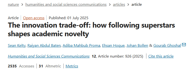 [4] Kelty, S., Baten, R. A., Adiba Mahbub Proma, Hoque, E., Bollen, J., & Ghoshal, G. (2025). The innovation trade-off: how following superstars shapes academic novelty. Humanities and Social Sciences Communications, 12(1). https://doi.org/10.1057/s41599-025-05124-z