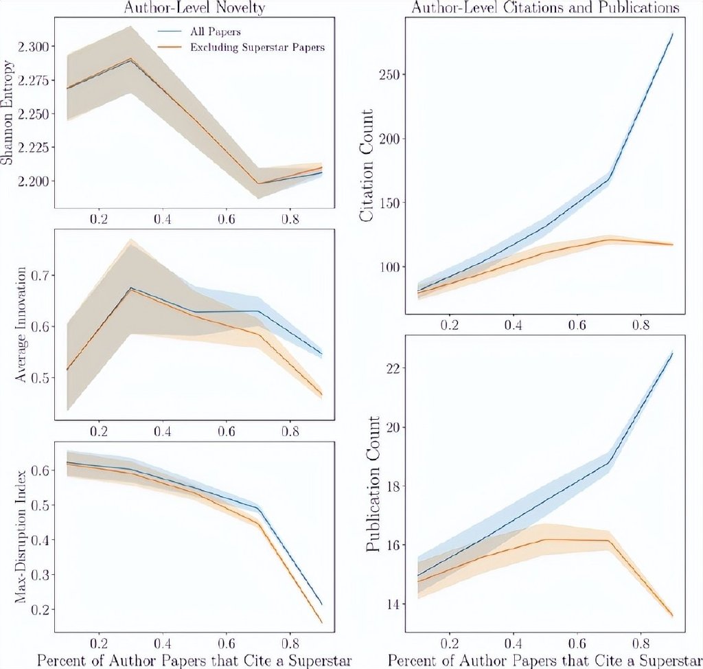 以上兩點説明:對於普通科研人員,如果他/她的研究中超過六成引用了頂尖科學家的論文,則佔比越高,那麼當他/她獨立開展與頂尖科學家無關的研究時,其發表論文的質量和數量都會顯著下降。至於這背後的原因,可能源於學術界的“近親婚配”,研究者和“學術巨星”的領域相同或相近,期刊會更優先選擇“大牛”的文章。