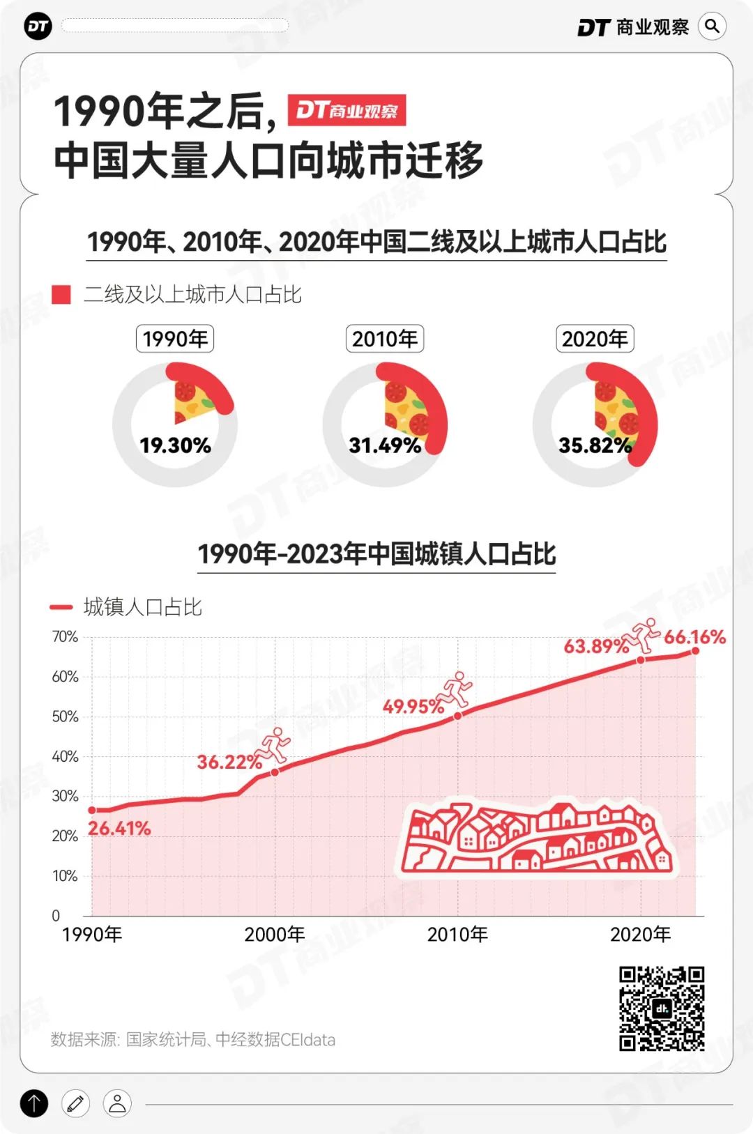 1990年,中國城鎮人口占比只有26.41%,2010年,已經接近50%,20年間中國城鎮人口大概增長了3.6億。大量的人口湧向大城市,到2010年,全國有近1/3的人口都在一線、新一線和二線城市。