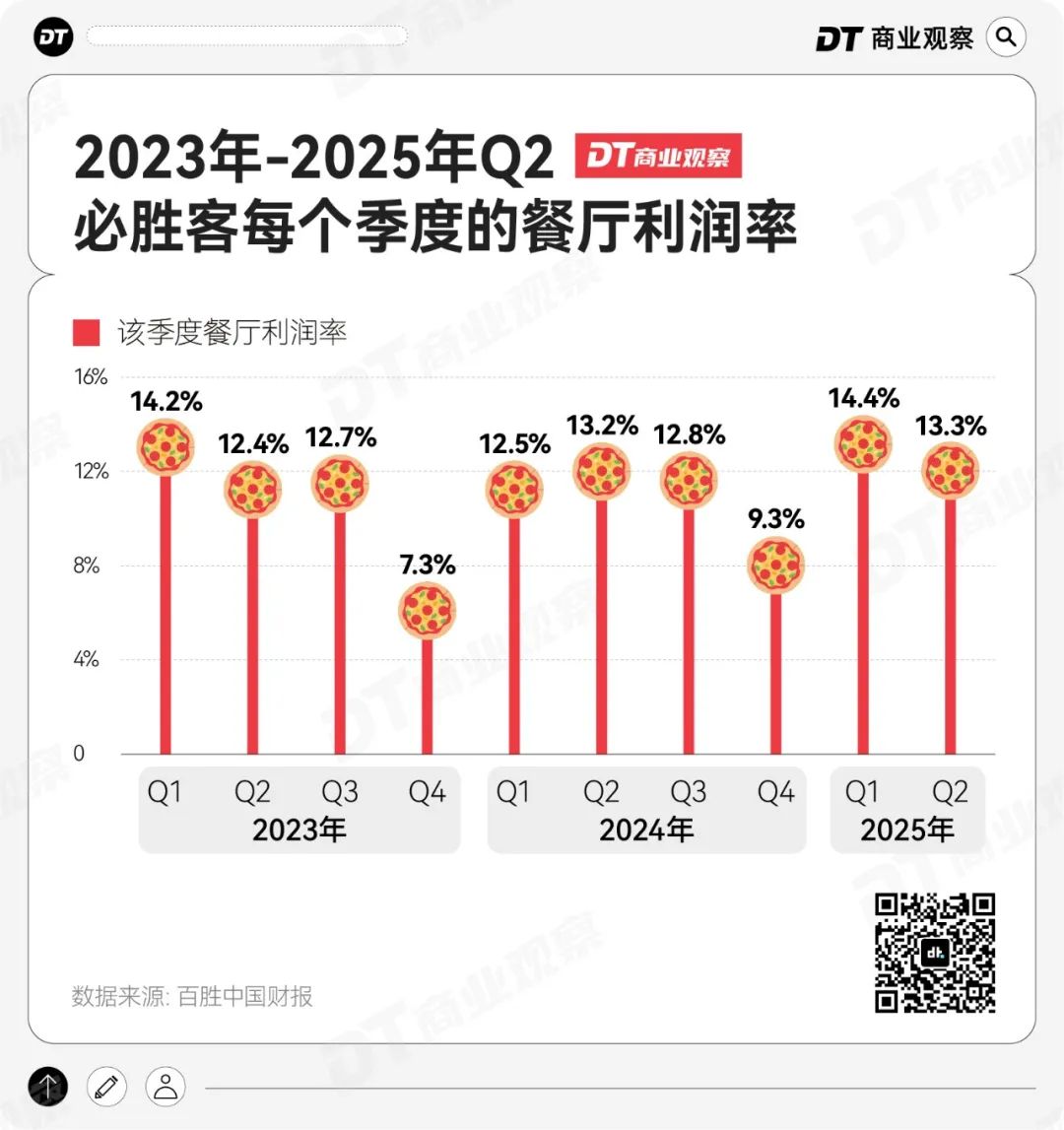 2024年開始,必勝客WOW門店模式為消費者提供了更具有性價比的選擇,但2024年Q2開始,每個季度餐廳利潤率都在同比增長,2025年Q1達到了14.4%,Q2達到了13.3%。