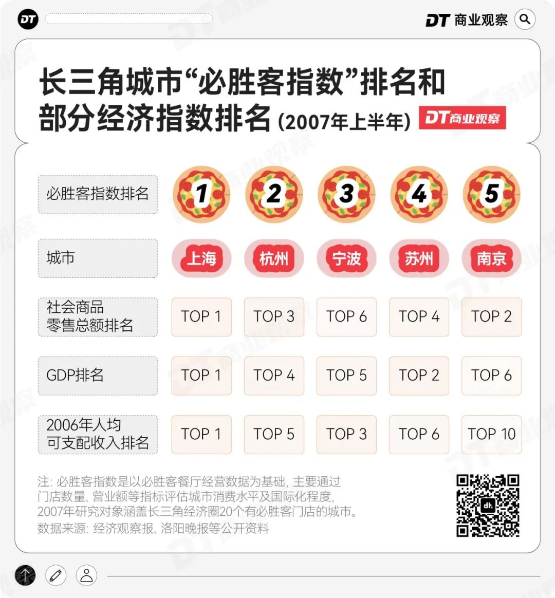 當年,一個有意思的説法叫“必勝客指數”。簡單來説,是把必勝客的經營數據(門店數量、門店銷售額等)摺合為指數,指數越高,意味着這座城市的發展等級、消費力、城市活力就越高。