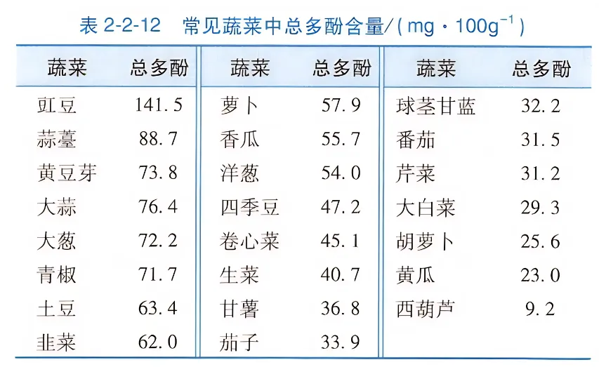 青橄欖中含有豐富的多酚類物質,包括黃酮類、酚酸類等,每 100g 鮮橄欖含酚類化合物 1174.0~1799.6mg。[4]大部分常見的蔬菜總多酚含量不到 100mg/100g,橄欖的含量是大多數蔬菜的 10 倍多。