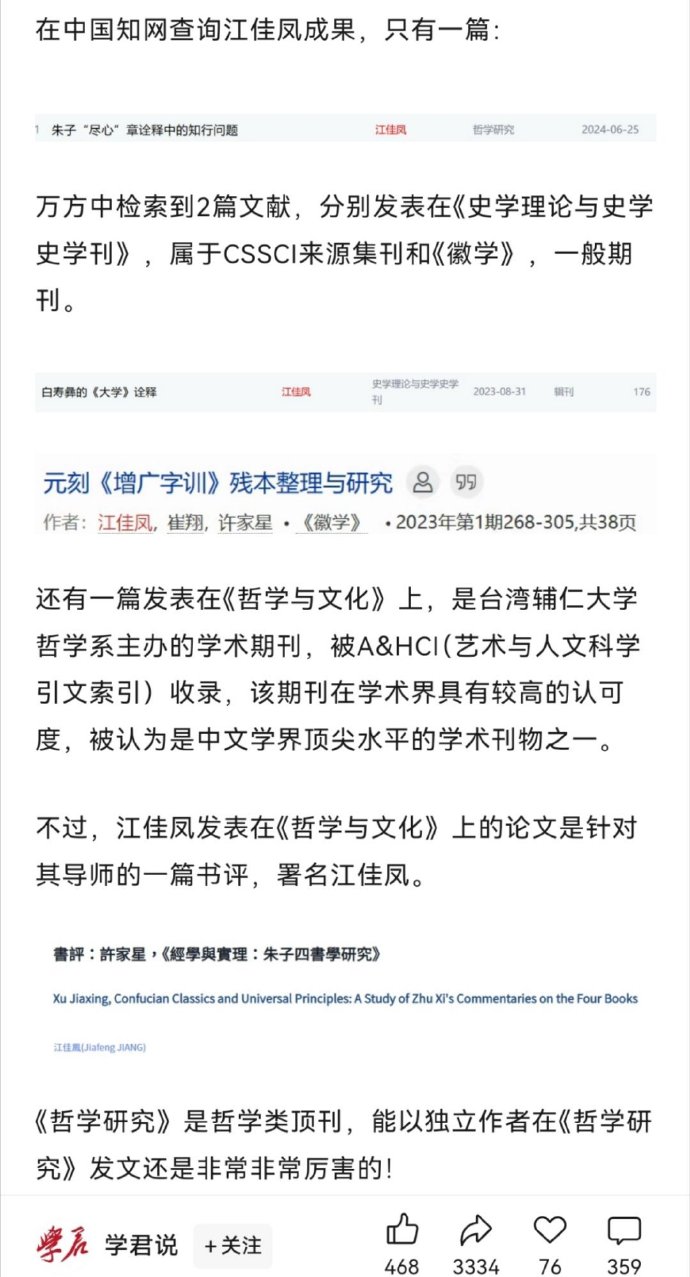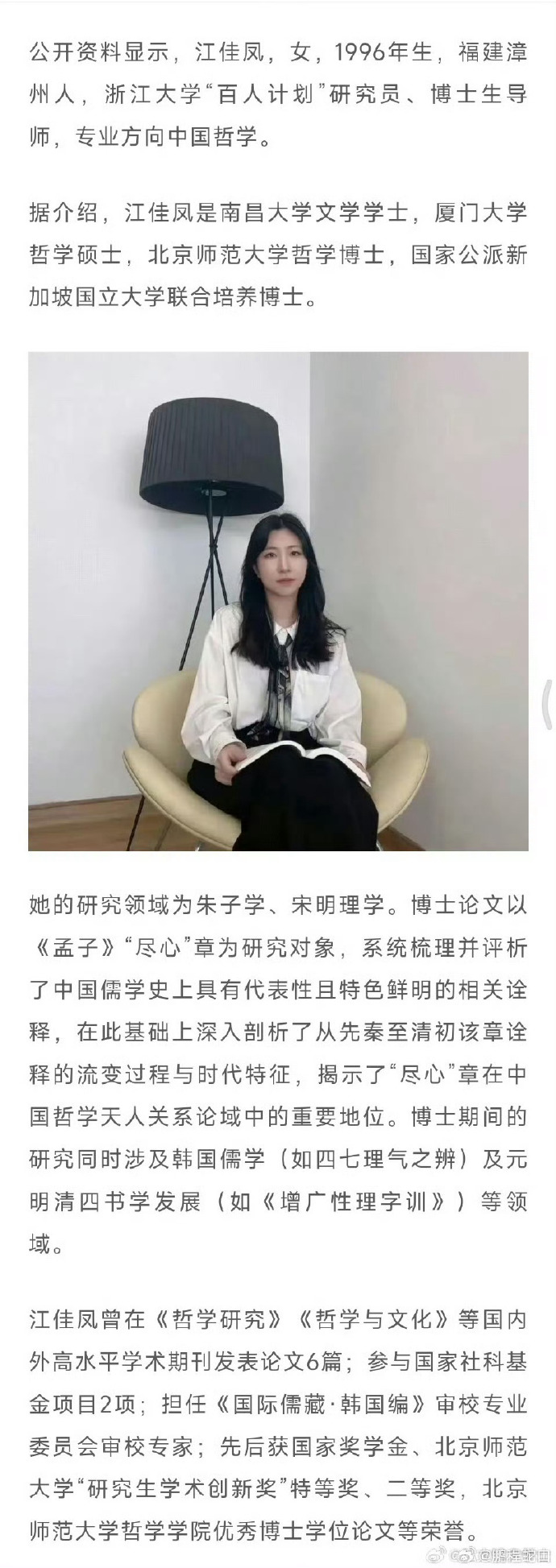 江佳鳳,2024年發表頂刊論文,論文是《書評:許家星,〈經學與實理:朱子四書學研究〉》,頂刊《哲學與文化》(屬於台灣輔仁大學哲學系主辦的學術期刊)。同時。還擔任《國際儒藏·韓國編》審校專業委員會審校專家。