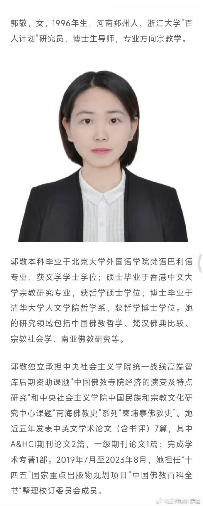 郭敬,2019年7月至2023年8月(23歲到27歲),她擔任“十四五”國家重點出版物規劃項目“中國佛教百科全書”整理校訂委員會成員。