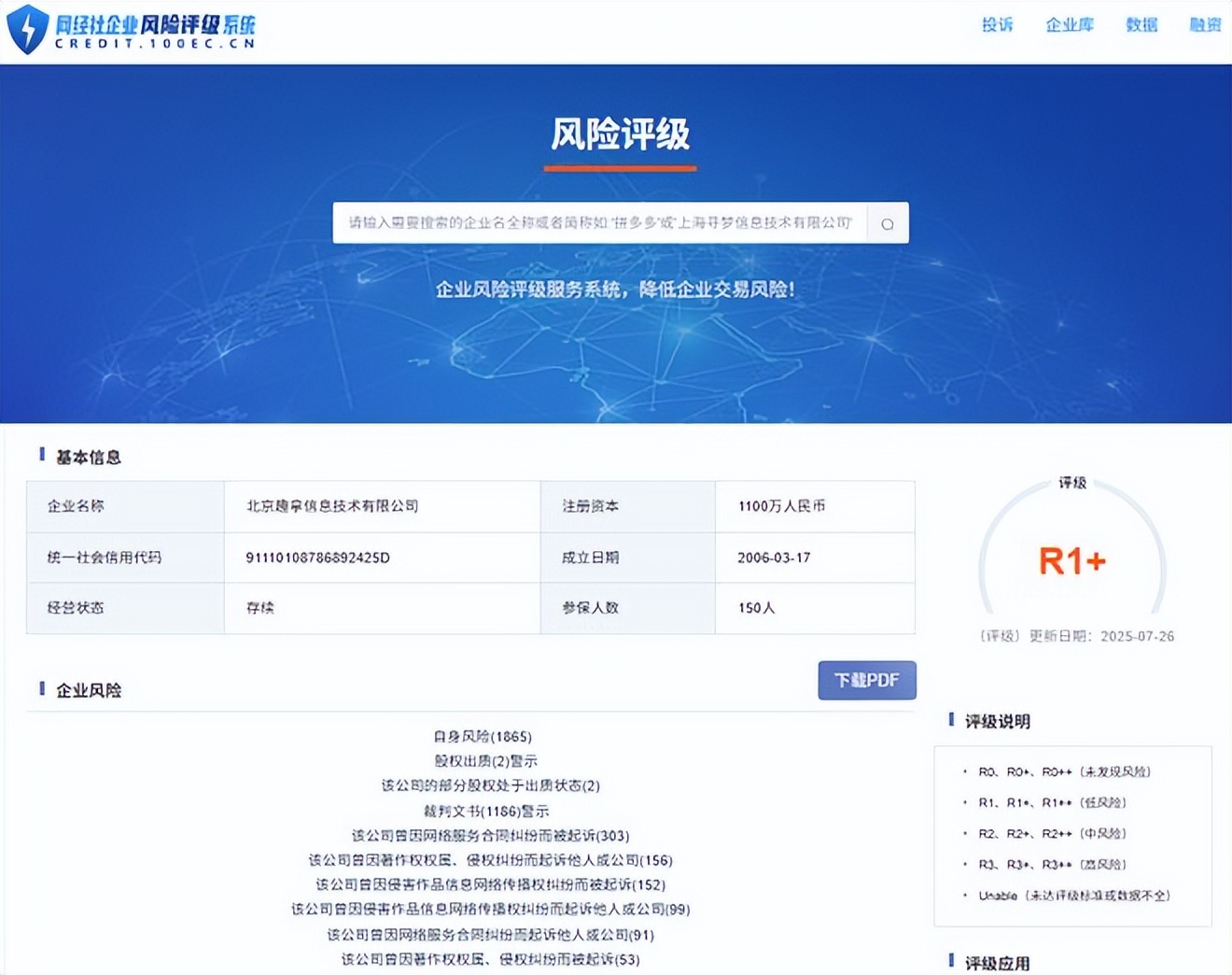 據網經社“企業風險評級系統”顯示,“去哪兒”所屬北京趣拿信息技術有限公司,風險評級為R1+,公司目前處於低風險。