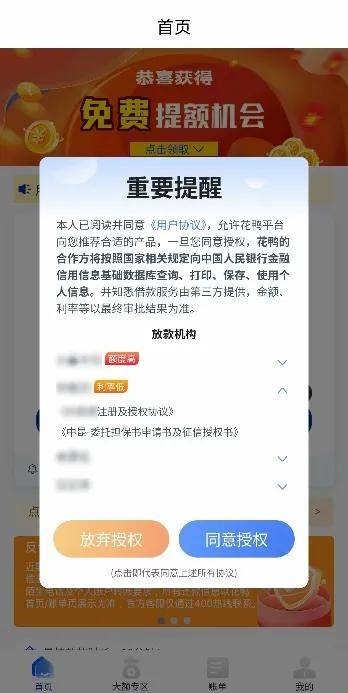 這意味着,“花鴨借錢”的運營模式並非依據借款人所填寫的詳細信息,運用科學的風控模型對借款人資質進行嚴謹審核,進而精準確定授信額度,並將其合理匹配給銀行等資金方。而它採取的是一鍵授權的簡便粗暴方式,將借款人的個人信息“共享”至其他助貸機構,這種做法不僅違背了金融行業規範的風險管理原則,也引發了對於借款人個人信息安全的深切擔憂。