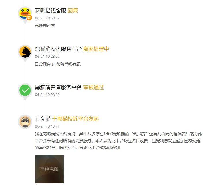 另一個投訴顯示,借款人反映,在花鴨借錢平台借貸,其中存在1400元所謂的“會員費”還有幾百元的擔保費。然而,平台並未有任何所謂的會員服務。