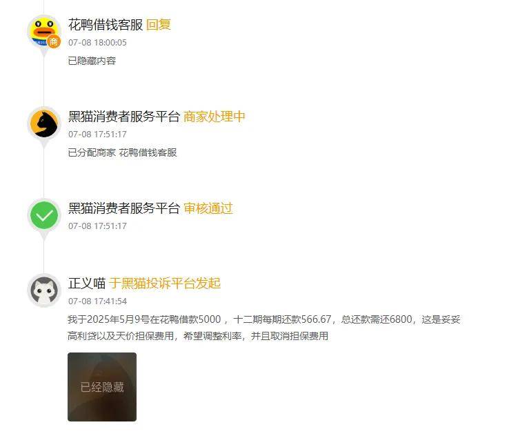 在黑貓投訴平台上,有用户反映,2025年5月,其在花鴨借錢平台上借款5000元,十二期每期還款566.67元,總共需還款6800元。按此來計算,1800元借款成本佔5000元本金的36%。對此,該用户表示,希望調整利率,並取消擔保費用。