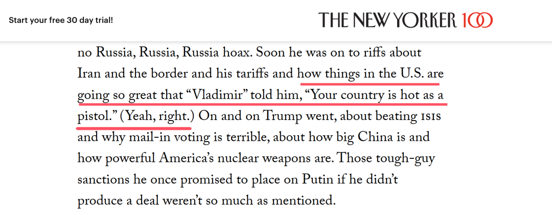 特朗普的語言往往帶有表演性與煽動性,“hot as a pistol(熱得發燙)”與“dead(涼了)”形成鮮明反差,既誇張又接地氣,讓人過耳難忘。實際上,這句“pistol”隱喻的核心意思無非就是 “doing great”。如《紐約客》所釋: