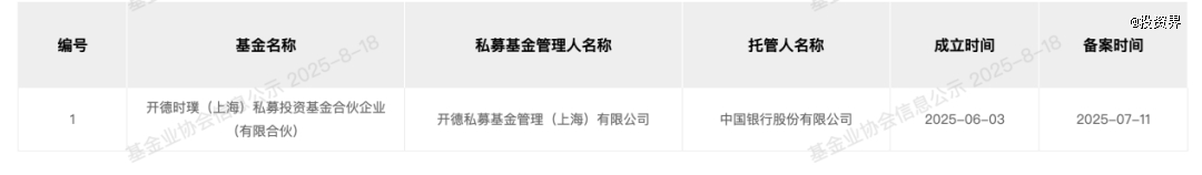 中國證券投資基金業協會顯示,開德時璞(上海)私募投資基金合夥企業(有限合夥)(簡稱:開德時璞(上海))成立於2025年6月,註冊地在上海浦東市,基金類型是“股權投資基金”,幣種為人民幣現鈔,開德私募基金管理(上海)有限公司(簡稱:開德(上海))為基金管理人,背後正是KKR。