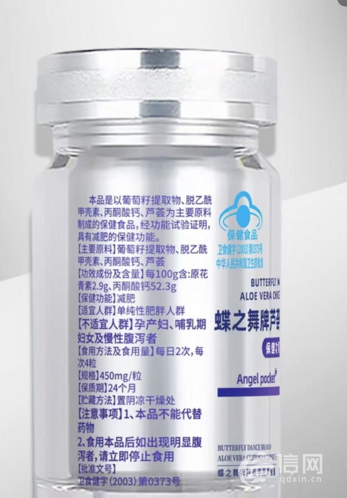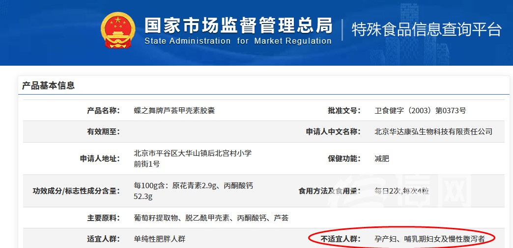 信網查詢到,國家市場監督管理總局特殊食品信息查詢平台顯示,涉事的蝶之舞牌蘆薈甲殼素膠囊批准文號為衞食健字(2003)第0373號,生產企業為北京華達康弘生物科技有限責任公司,其登記的保健功能為減肥,主要原料包括葡萄籽提取物、脱乙酰甲殼素、丙酮酸鈣、蘆薈,適宜人羣為單純性肥胖人羣,而不適宜人羣中則明確包含孕產婦、哺乳期婦女及慢性腹瀉者。