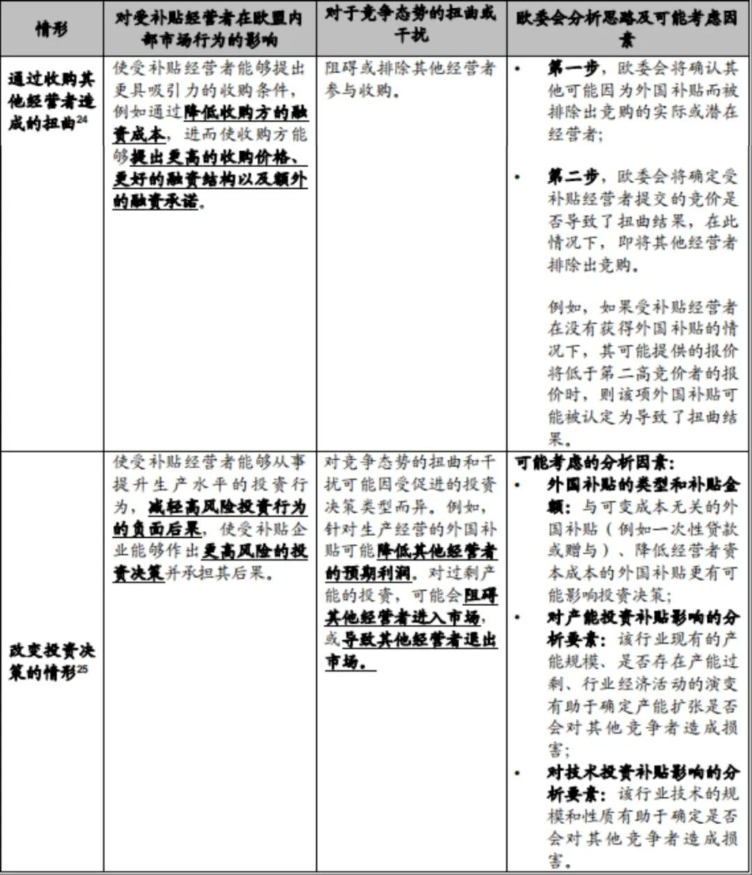 以“通過收購其他經營者造成的扭曲”以及“對受補貼經營者的投資決策的改變”為例, 我們在下表中總結了在此情況下,外國補貼對受補貼經營者在歐盟內部市場行為的影響、對於競爭態勢扭曲或干擾的表現形式,以及歐委會的分析思路及可能考慮的因素: