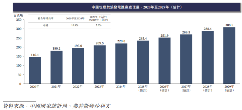 2024年我國生活垃圾產量達到2.6億噸,同時垃圾焚燒進廠處理量增長至2.2億噸,2020年至2024年垃圾焚燒進廠處理的複合年增長率為10.8%。