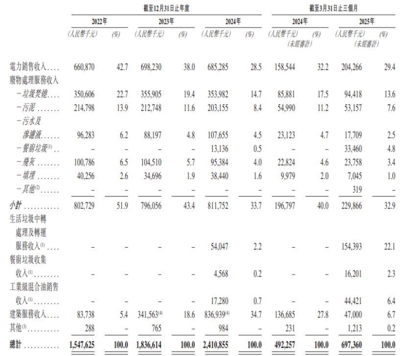 具體來看,2022年至2025年前三個月,軍信股份的電力銷售收入佔總收入的比例從42.7%降至29.4%;廢物處理服務收入佔比從51.9%降至32.9%;生活垃圾的中轉處理、壓縮及轉運業務從2024年開始產生收入,2025年1-3月佔比為22.1%;餐廚垃圾收集、工業級混合油銷售等業務收入佔比較低。