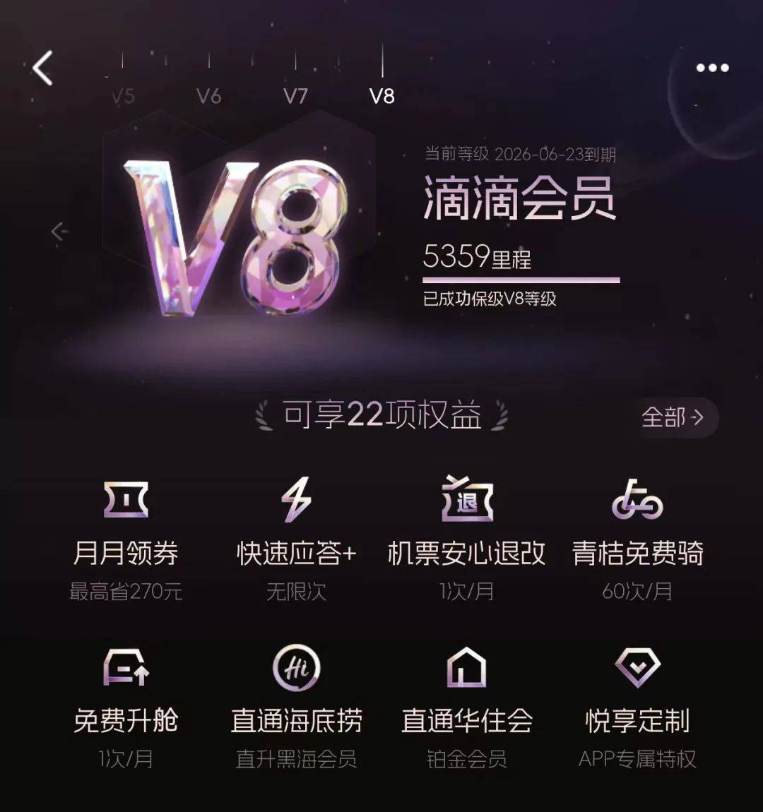 在打車權益優化上,滴滴針對不同等級會員提供差異化服務。以V8會員為例,每月可領取價值最高270元的打車券包;“無限次快速應答”年均省時200分鐘以上;“免費升艙”以快車價享專車服務;“免取消費”“極速賠付”解決用户後顧之憂。