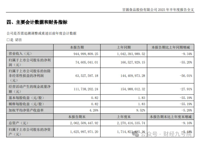 中報數據顯示,2025年上半年,甘源食品實現營收9.45億元,同比減少9.34%,歸母淨利潤僅為7460萬元,同比大幅下滑了55.2%。
