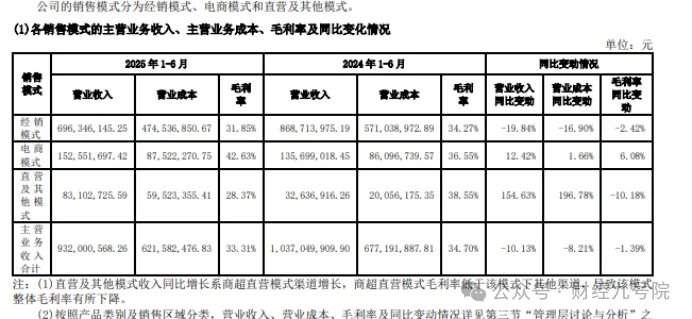 數據顯示,2022年至2024年甘源食品的銷售毛利率分別為34.26%、36.24%、35.46%,至今年半年報是下滑至33.61%,在上述表格中,作者也發現,經銷模式、直營模式的毛利率較上年同期均有所下滑,總的毛利率也同比下滑了1.39%;