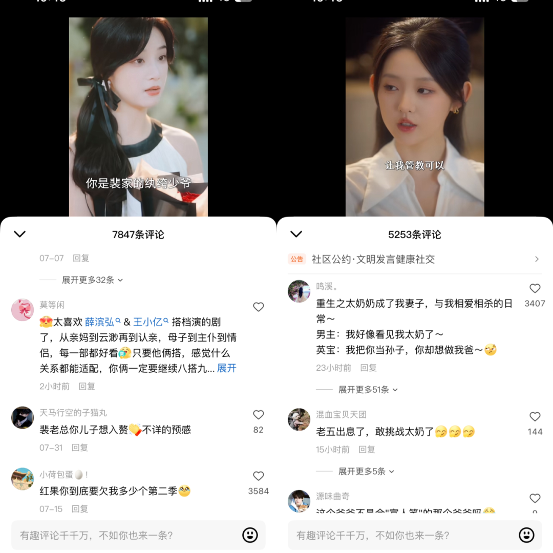 另一種則是通過演員的新搭配去發掘新的CP。柯淳雖有《好一個乖乖女》中和餘茵的CP爆火,但其與侯呈玥、翟一瑩合作的短劇也在暑期檔釋放了熱播效應。嶽雨婷的“雨過添晴”和“魚翅”CP,各有擁護者。王格格雖有申浩南做固定搭配,但她與王凱沐合作的《第六次攻略》《昭昭於禮》也讓一羣人“磕到了”。