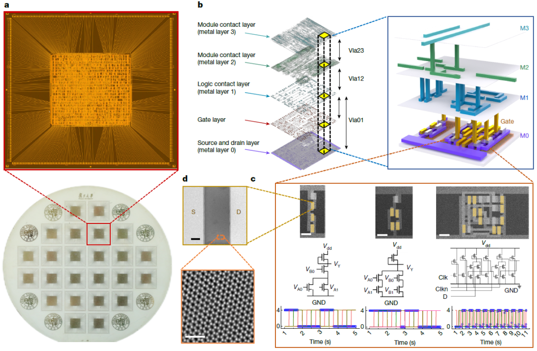 a,底部為在 4 英寸藍寶石晶圓上製備的 24 個 WUJI 芯片;頂部為放大的光學顯微鏡圖像,顯示單個芯片裸片,面積為 6 mm×6 mm,包含 5900 個二硫化鉬(MoS₂)晶體管,輸入輸出焊盤分佈在周邊;