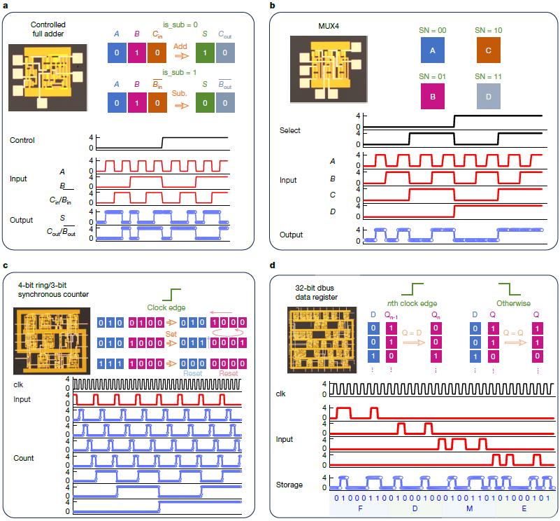 a–d,受控全加法器(a)、4 輸入多路複用器(b)、4 位環形計數器和 3 位同步串行計數器(c)以及 32 位寄存器(d)的電路結構(左上)、基本邏輯功能(右上)和典型實驗測量邏輯輸出(下圖)。d 的底部是存儲四個 8 位 ASCII 碼‘F’、‘D’、‘M’和‘E’的實驗演示。MUX 為多路複用器;Sub. 為減法;SN 為 n 位選擇信號。