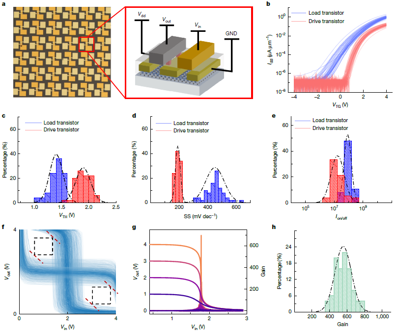 反相器作為數字電路的基礎單元,其良率直接反映了芯片整體質量。與硅晶圓的直拉法生長不同,二維材料需通過化學氣相沉積(CVD)製備,易產生缺陷與不均勻性。為確定 WUJI 芯片 6 mm ×6 mm區域內反相器的良率,作者製備了一個 30×30 的反相器陣列(共900 個單元)。所有反相器的傳輸特性曲線如圖 f 所示。結果顯示,898 個反相器可正常工作,良率達 99.77%,整體噪聲容限為 0.5 V。正常工作的反相器其開關電壓分佈在 1.4 - 2.5 V 範圍內,平均增益超過 550。這一成果不僅驗證了二維材料器件的可靠性,更為先進數字邏輯電路的實現提供了堅實基礎。