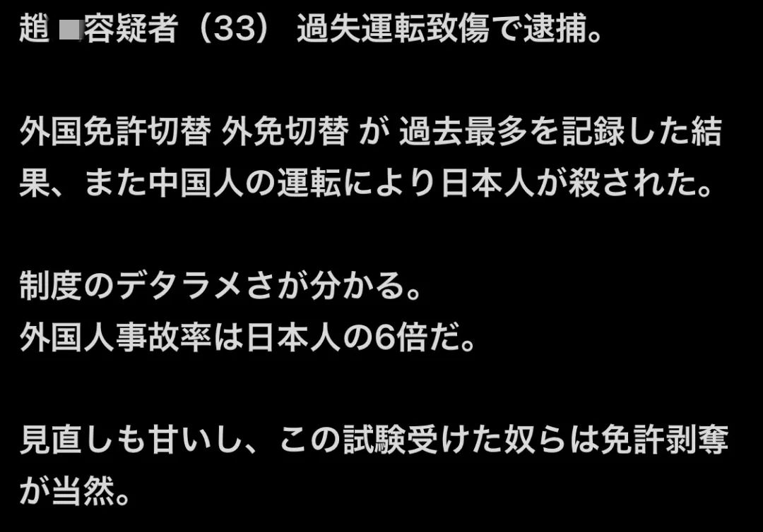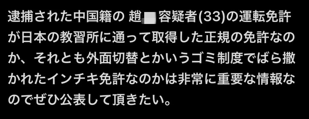 “被捕的中國籍嫌疑人趙某(33歲),他的駕駛執照究竟是通過在日本駕校學習取得的正規駕照,還是通過所謂“外國駕照換日本駕照”這種垃圾制度發放的虛假駕照,這是極其重要的信息,希望相關部門務必公開説明。”