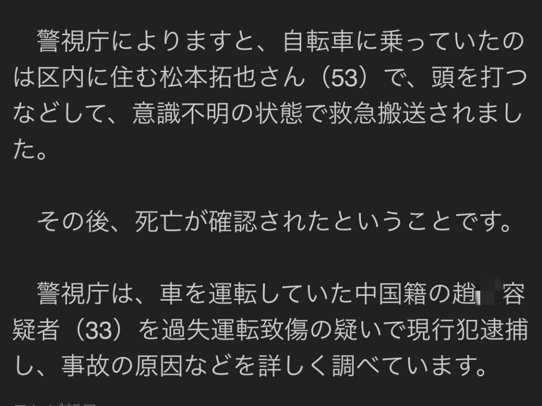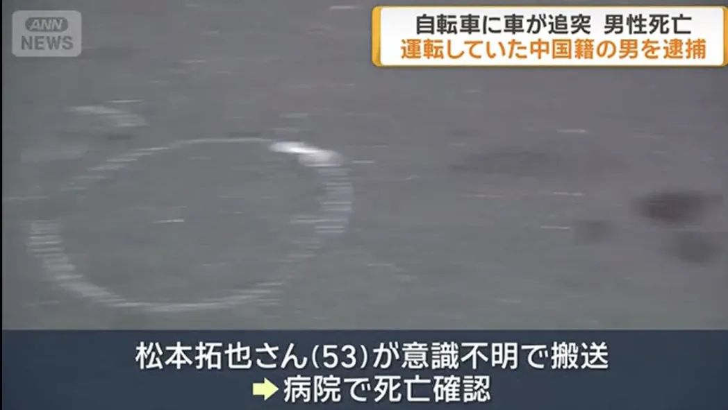 一名騎行中的日本男子被後方駛來的汽車追尾,因頭部受傷不治身亡。涉事駕駛員為一名33歲的中國籍男子——趙某。