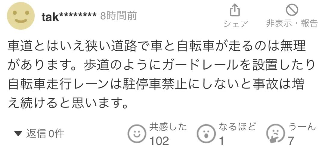 “即便名義上規定自行車走車道,但在狹窄道路上讓汽車和自行車並行,本身就存在很大問題。如果不在類似人行道那樣設置護欄隔離,或者明確規定自行車道內禁止停車、停靠,那麼事故只會不斷增加。”