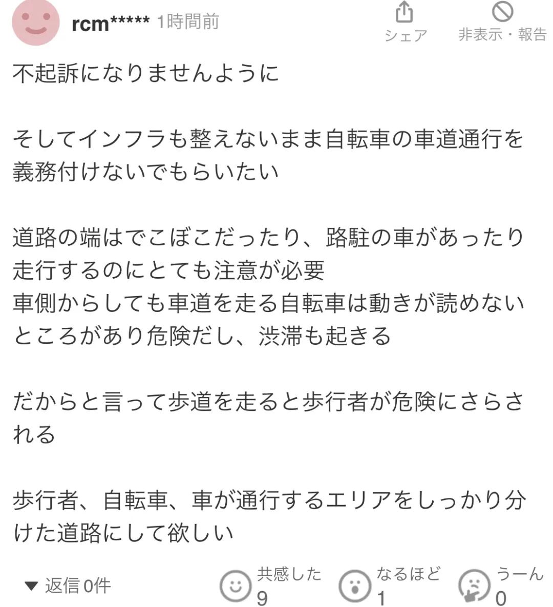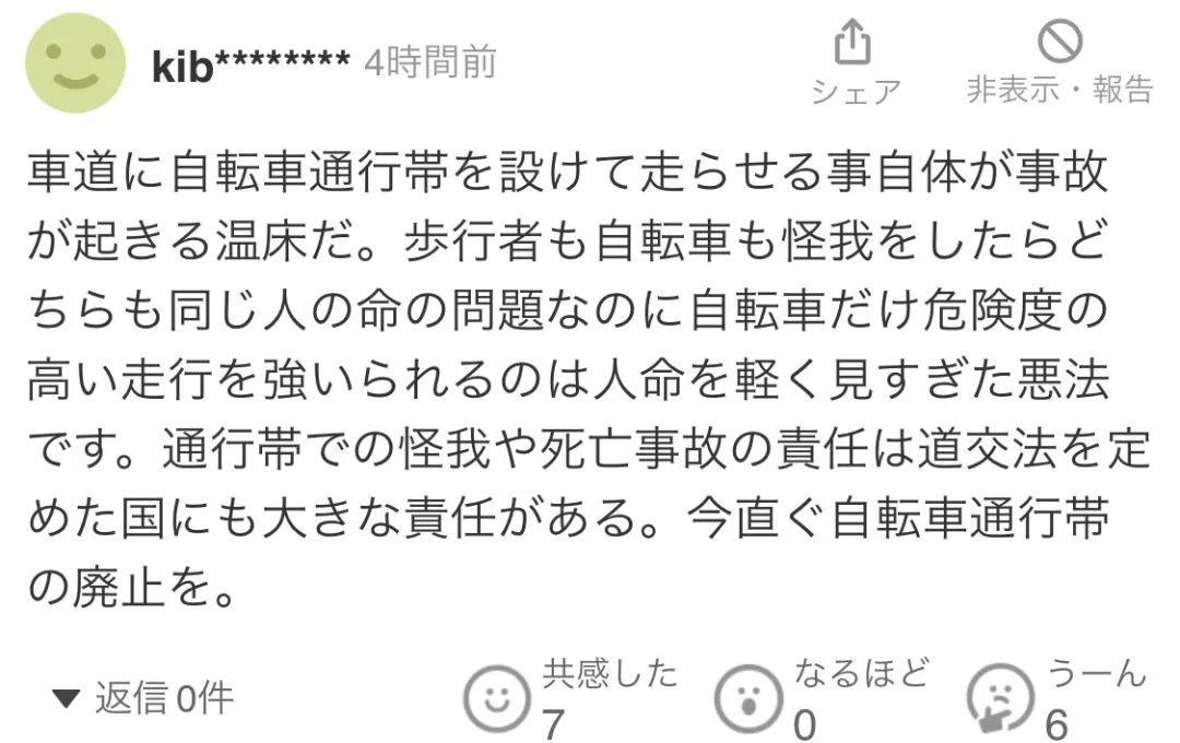 “在車道上設立自行車專用道並強制通行,本身就是事故頻發的温牀。行人和自行車一旦受傷,都是人的生命問題,可自行車卻被迫承擔更高風險的行駛,這種法律明顯低估了人命的重要性。通行道上發生的受傷或死亡事故,其責任也應由制定道路交通法的國家承擔。應立即廢止自行車專用車道。”
