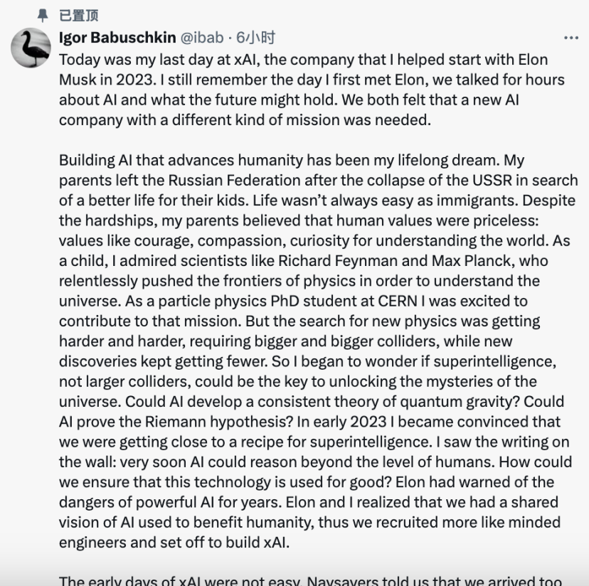 也許答案就在他在X上發佈的“離別感言”中——馬斯克教會了他“始終保持近乎瘋狂的緊迫感”。作為AI頂尖人才,Igor清楚,當下最緊迫的事項就是即將到來的AGI。