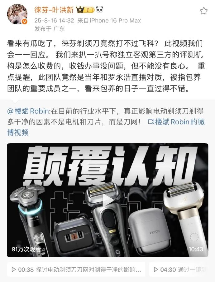 對此,自媒體博主樓斌回應稱,內容良心不在是否“恰飯”,而在如實呈現產品體驗,觀眾自有判斷。若對此次鬍渣剃淨一鏡到底對比有異議,可自行用同樣方式驗證。在拍視頻前測了幾十輪了,雖然每次結果輕重各有不同,但不影響整體結論。
