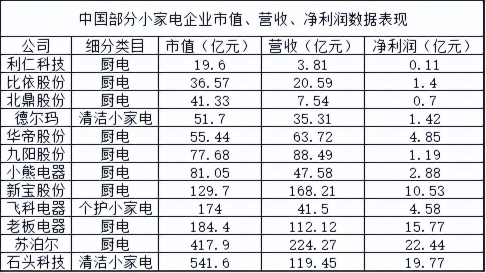 從已經上市的小家電公司來看,年營收通常在幾十億,淨利潤大多為幾億——最高的蘇泊爾2024年營收剛剛突破220億元,淨利潤為22.44億元;最低的利仁科技2024年營收為3.81億元,淨利潤剛剛突破0.1億元。這也造成了小家電企業市值普遍不高——最高的石頭科技目前市值大約為541億元。